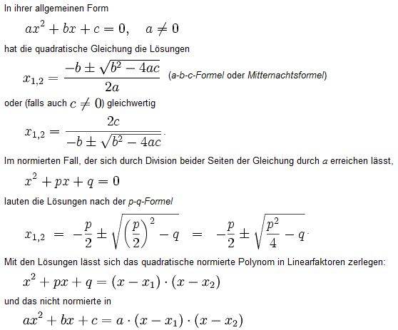 Zum Finden von Lösungen einer quadratischen Gleichung kann man die quadratische Ergänzung benutzen. Da die quadratische Gleichung stets die gleiche Struktur aufweist, bietet es sich an, eine allgemeinere Formel herzuleiten. Es ergeben sich zwei Lösungsformeln, die als abc-Formel (auch Mitternachtsformel, weil jeder mitten in der Nacht geweckte Schüler diese Formel ohne nachzudenken aufsagen können soll) und als p-q-Formel bekannt sind.