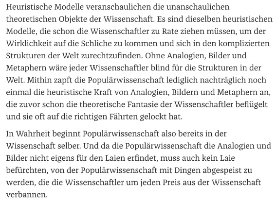 Vielleicht hätten wir eine bessere Wissenschaft, wenn wir eine bessere Populärwissenschaft hätten. Eben weil dann junge Leute einen besseren, weniger abschreckenden, ermutigerenden Einstieg in die Wissenschaft und deren Grundfragen erhielten!