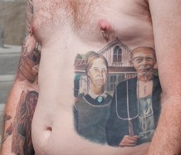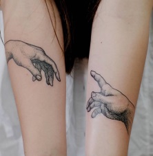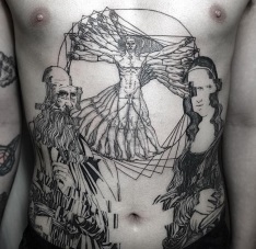 gezeichnet hat. Was da im Bild gleichzeitig erscheint, wäre aber eigentlich nur durch Bewegung nacheinander möglich, was der Zeichnung wohl ihre besondere Dynamik gibt, die ein Tätowierkünstler schön erkannt und weitergedacht hat: