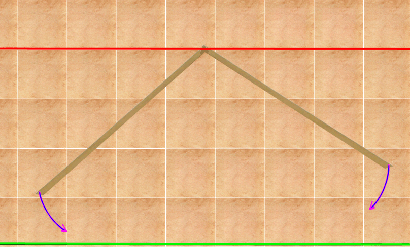 um eine Parallele zur Raumwand in 2 m Entfernung zu erhalten. Dazu legt man die beiden Dachlattenspitzen zusammen auf diese Parallele und dreht danach die beiden losen Enden nur noch gegen die Wand:
