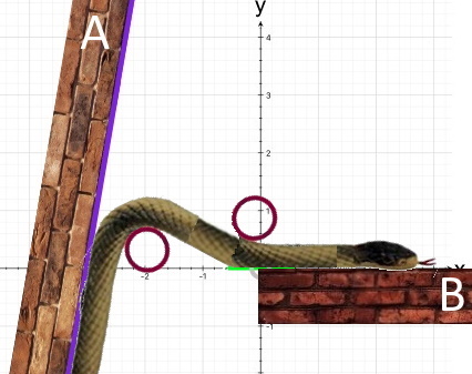 Weil unsere Schlange immer Mauerkontakt sucht, möchte sie auch möglichst schnell über die Lücke zwischen den beiden Mauern hinweg kommen. Der kürzeste und damit schnellste Weg zwischen beiden Bauern ist aber "eigentlich" dieser: ![]() "eigentlich", weil eine Schlange keine Knicke "gehen" kann
