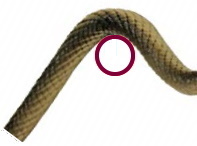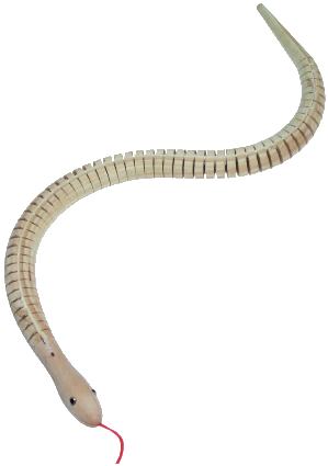 ![]() ![]() Um aber eine Schlange zu begreifen, be-greift man sie am besten. Nur woher ein Schlange nehmen? Immerhin gibt es aber solch eine 1,3 m lange, erstaunlich echt wirkende und nur schlappe 13 € teure Gummischlange zu kaufen: ![]() (Kleiner Nachteil: bei dieser Schlange kann man die Rippen nicht sehen.) Und glücklicherweise gibt es solche Spielzeuge: ![]() Solch eine Spielzeugschlange besitzt zwar keine Rippen, aber sie ist aus Holzscheiben aufgebaut, die durch einen biegsamen Stoffstreifen verbunden sind, und diese Kombination ist eine schöne Illustration genau jenes Aspekts einer echten Schlange, der uns hier interessiert, nämlich was passiert, wenn eine Schlange sich biegt. Schauen wir uns dazu das vergrößerte Mittelteil der Holzschlange mal genauer an: ![]()