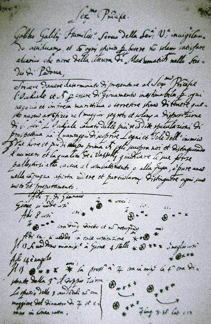 "Die Beobachtung des Planeten Jupiter zeigt, dass er eigene Begleiter hat: Um seine Scheibe herum kann man vier kleinere Lichtpunkte sehen, deren Positionen sich mit der Zeit verändern."
