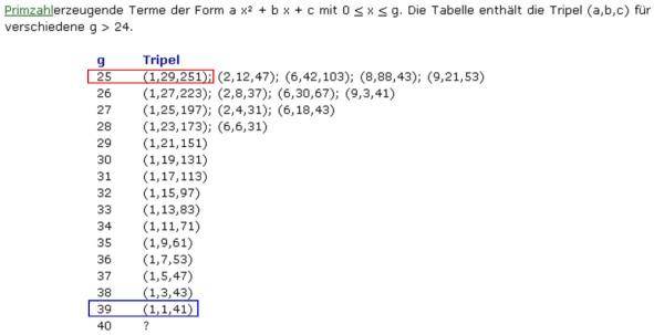 Beispielsweise erzeugt also (rot umrandet) auch n2 + 29n + 251 eine Serie von Primzahlen (für n = 1 bis n = 25), aber die blau umrandete Kombination zeigt: