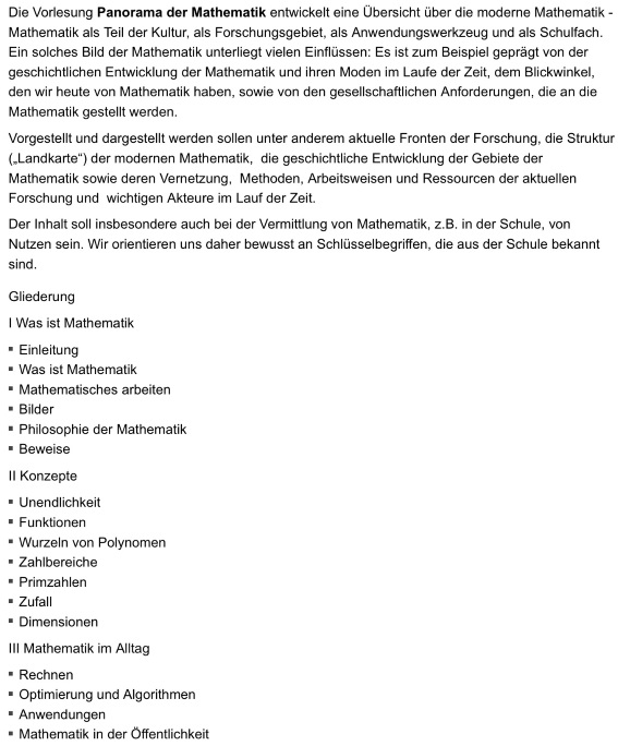 (eine Art der Vorlesung, die auch im regulären Mathestudium an jeder Uni angeboten werden und zum Pflichtprogramm für alle Mathestudenten werden sollte - wobei ich allerdings skeptisch gegenüber jeder lieblos erfüllten Pflicht bleibe.)