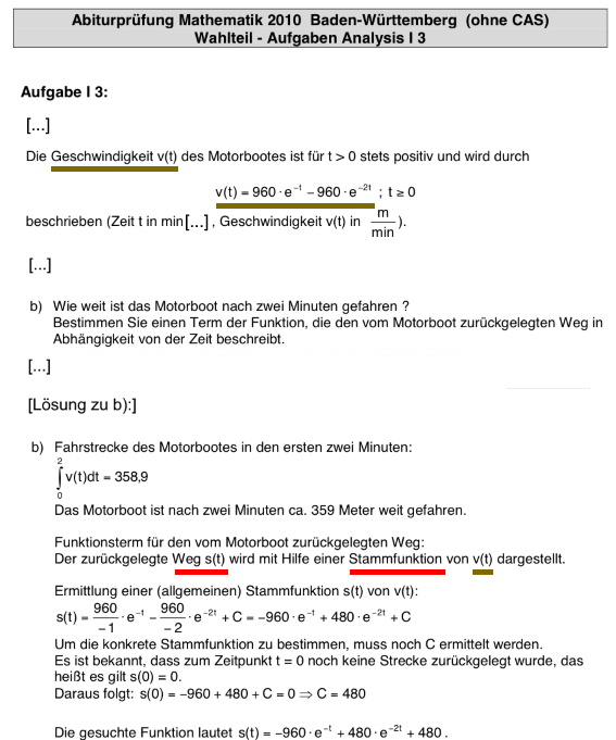 Manchmal geben Lehrern aber aus purem Übermut die Geschwindigkeitsfunktion als Ausgangsfunktion f . Dann rutschen alle Funktionen eine Zeile weiter nach oben und ist die "Weg-Funktion" mittels Stammfunktion zu ermitteln: