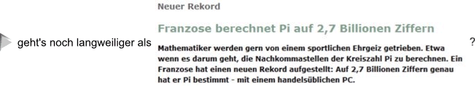 π = 3,14159 26535 89793 23846 26433 83279 50288 41971 69399 37510 58209 74944 59230 78164 06286 20899 86280 34825 34211 70679 und in alle Ewigkeit auf unregelmäßige Weise weiter