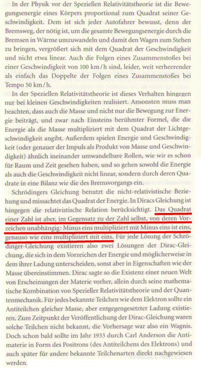 Weil ich aber nicht Physiker, sondern "nur" Mathematiker bin, bleibt mir unklar, weshalb die Existenz einer negativen mathematischen Lösung schon die reale Existenz eines Antiteilchens "vorhersagt" (statt z.B. "möglich erscheinen lässt"): in der Mathematik gibt es doch allzu viele Fälle, bei denen etwas rechnerisch herauskommt, was aber von Anfang an aufgrund eines eingeschränkten Definitionsbereichs gar nicht möglich ist.