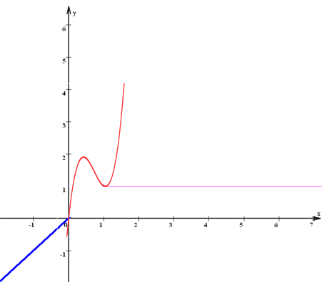 (der häufige Irrtum ist nämlich, dass immer ein absolutes Extremum vorkommen muss, wenn auch ein lokales vorkommt: wir schließen alle allzu leicht von "größer" auf "der Größte"),der Funktionsgraph aber anderswo höher (tiefer) liegt,