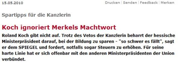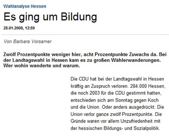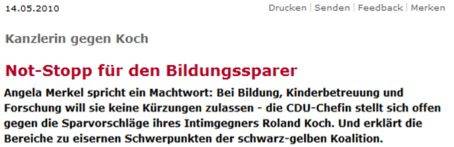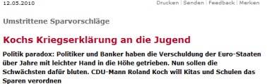 (bzw. vielleicht nicht mal Koch ganz unrecht: falls denn wirklich gespart werden muss, muss sich jeder Bereich Kürzungsanfragen gefallen lassen; ich wüsste also auch im Bildungsbereich allerlei einzusparen - z.B. die gesamte ebenso gigantische wie überflüssige, ja hemmende Kultusbürokratie; und ich erhoffe ansonsten sowieso keine großartigen Besserungen von einfach nur mehr Geld für den Bildungsbereich - außer bei mehr Geld für mehr LehrerInnen, also kleinere Klassen!