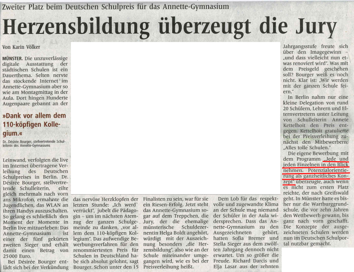 Das heißt nicht, dass ich dem Annette-Gymnasium die Eignung für den Deutschen Schulpreis absprechen möchte: ich kenne einfach nicht - jenseits des heeren Programms - die Alltagswirklichkeit an dieser Schule, sondern weiß nur vom Hörensagen, dass sie in Münster einen guten Ruf hat