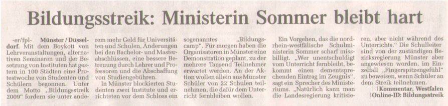 Ich befürchte den sofortigen Untergang des Abendlandes, wenn SchülerInnen heute, also am 17.6.09, morgens während der Unterrichtszeit "blau" machen, um an einem - horribile dictu - Streik teilzunehmen. Solche Versuche muss man schon vorweg rabiat unterbinden, und deshalb bin ich der NRW-Kultusministerin hochdankbar: