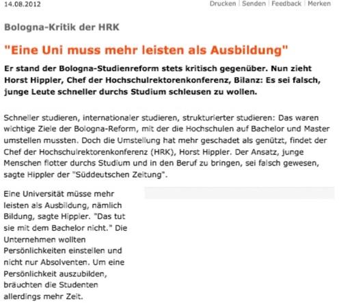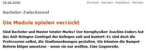 Dass die Umstellung der Studiengänge auf Bachelor & Master Murks ist, habe ich von Anfang an gesagt, nur nicht laut, d.h. auf diesen Internetseiten. Einiges lohnt nicht laut zu sagen, weil man mit seiner Meinung (scheinbar?) ganz allein dasteht und also eh nicht gehört wird. Da muss man halt abwarten, bis sich (verlässlich) ein Gegentrend andeutet, dem man dann immerhin von den Rängen aus applaudieren kann: