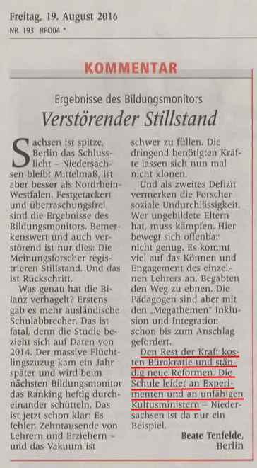 (Wenn derart ein neuer schulpolitischer Ton in die "Westälischen Nachrichten" einzieht, liegt das vermutlich daran, dass der Kommentar nicht mehr von der notorischen "Schulexpertin" Dorle Neumann stammt.) |