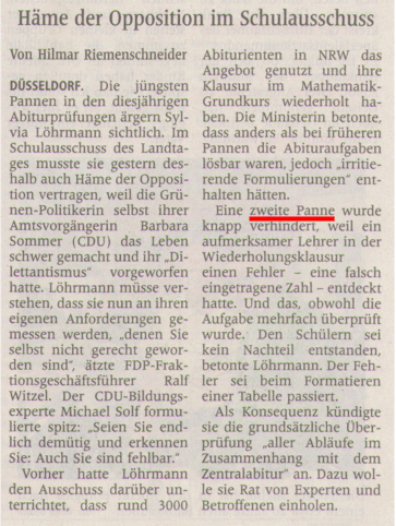 Dienstag 3. April 2007, 17:52 Uhr[...] Ein Fehler in einer Zentralabitur-Aufgabe im Fach Deutsch wird keine Auswirkungen auf die Benotung der Klausuren haben. «Kein Schüler muss jetzt befürchten, dass es deshalb eine schlechte Note gibt», versicherte Schulministerin Barbara Sommer (CDU) am Dienstag in Düsseldorf.