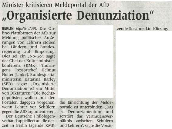 Ich kann nur hoffen, dass zügig rechtsstaatliche Mittel gefunden werden (können), den AfD-Landesverbänden die Nennung unliebsamer Lehrern auf ihren Internetseiten zu verbieten.