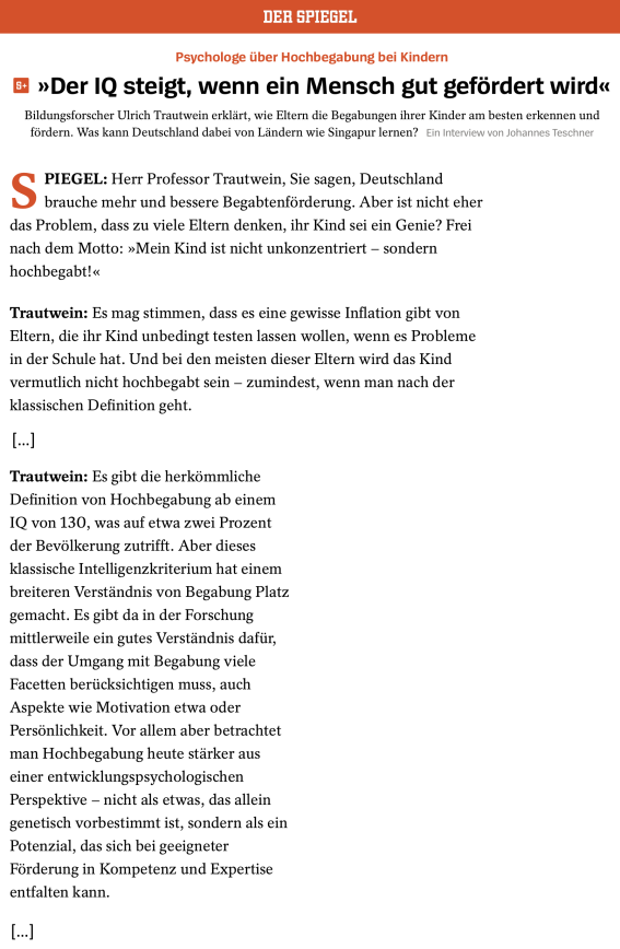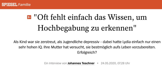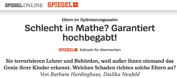 (Nebenbei: man holt sich ja auch selbst den ärger ins Haus: was soll ein angeblich hochbegabtes Kind denn von seinen vermutlich durchschnittlichen Eltern halten?! Man wird ja nicht behaupten wollen - und unterstellt es dennoch andauernd, denn "der Apfel fällt nicht weit vom Stamm" -, dass man selbst auch hochbegabt sei.)