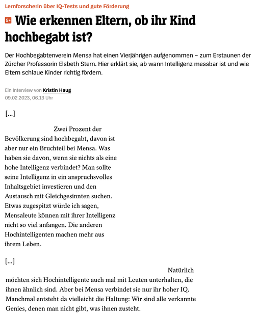"Ich halte es mit Karl Popper. Als Mensa ihn aufnehmen wollte, lehnte er ab mit der Begründung, er würde nie einem Verein beitreten, dessen einzige Existenzberechtigung der hohe IQ seiner Mitglieder sei. Sich einzig und allein gegenseitig zum IQ gratulieren? Nein danke."