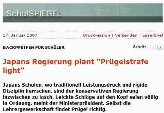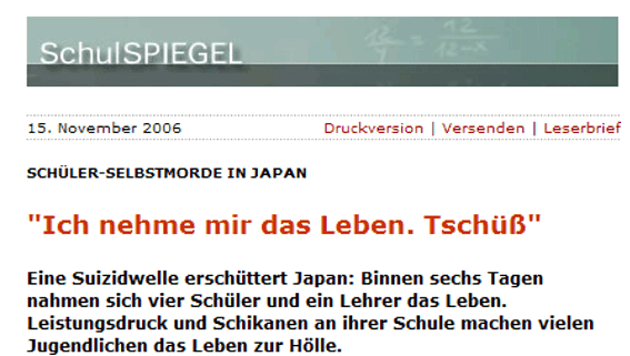 »Japanische Kinder sind heutzutage hohem Stress ausgesetzt«, sagte Aiko Shibata, Gründerin eines unabhängigen Kindergartens in Yokohama. Viele Eltern erzögen ihre Kinder schon von früh an dazu, »gute Kinder« in den Augen der Erwachsenen zu werden. Die Kinder versuchten ständig, sich dem Idealbild ihrer Eltern anzupassen. Es sei ein großer Stress für die Kinder, dass sie nicht akzeptiert würden, wie sie seien, sagte die Pädagogin im Gespräch mit der Nachrichtenagentur dpa. Viele Kinder litten heutzutage darunter, dass sie sich selbst nicht mögen. »Wenn man unzufrieden mit sich selbst ist, richtet man den Stress gegen die Schwächeren«, erklärte Shibata.