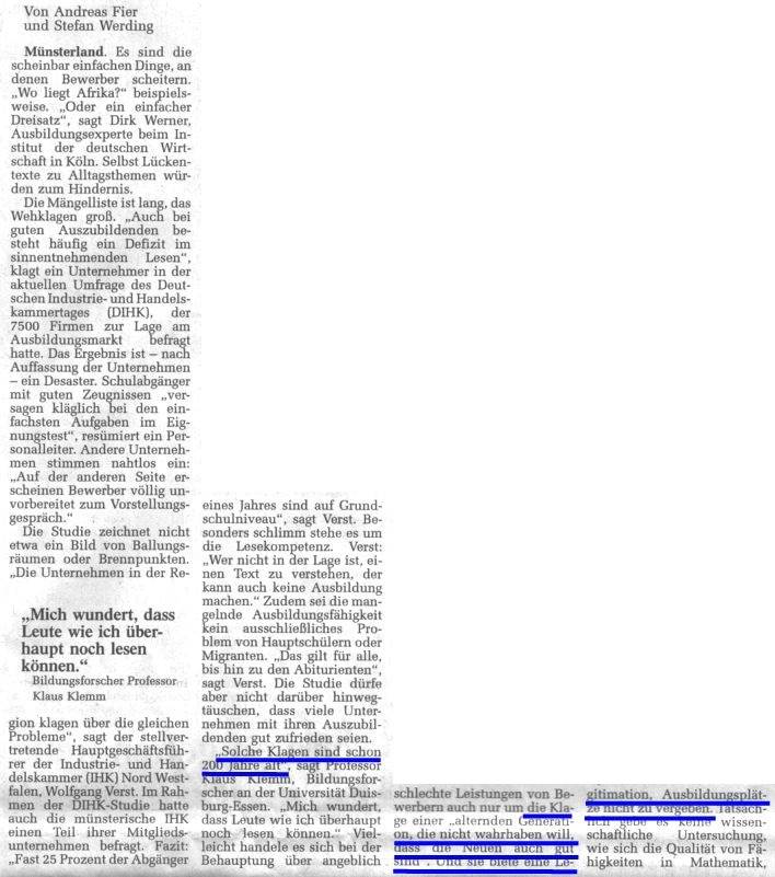 Über zu viele Abiturienten ("denen wird das Abitur ja nachgeschmissen") mokieren sich diejenigen, die schon selbst von der demokratischen (!!!) Öffnung der Gymnasien für die "breite Masse" in den 50er und 60er Jahren profitiert haben, nämlich vorher niemals das Abitur geschafft hätten.