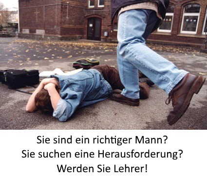 Nun ist es zwar ein Klischee, dass die heutigen Schüler an allen Schulen asoziale Monster sind, aber an einigen Schulen u.a. im Ruhrgebiet geht es eben doch "schwer zur Sache", und da habe ich zumindest Verständnis dafür, dass Junglehrer sich das nicht antun wollen oder (wohlwissend um die Grenzen ihrer Belastbarkeit) schlichtweg nicht zutrauen.