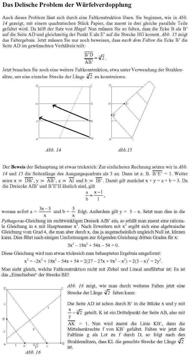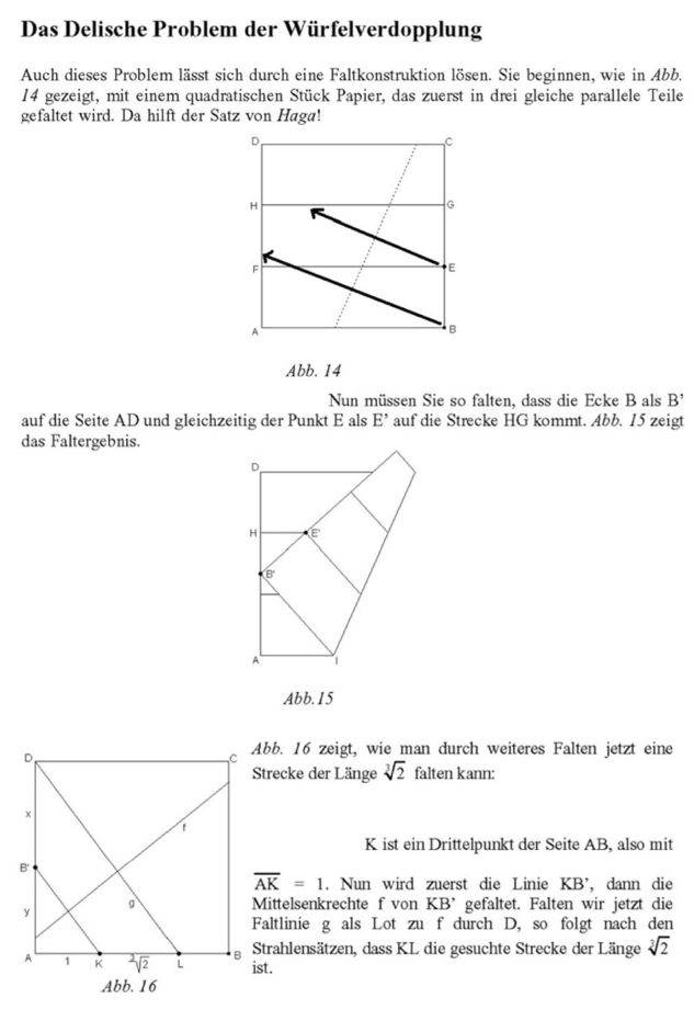 Bemerkenswert ist da u.a., dass die Würfelverdopplung eben doch möglich ist: zwar nicht mit Zirkel und Lineal, aber erstaunlicherweise mit Origami.