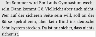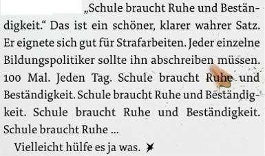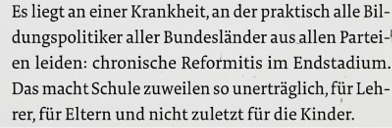 (also nicht, dass die deutsche Schulmisere im Föderalismus begründet wäre; bzw. dies höchstens in dem Sinne, dass da 16 gigantische Kultusbürokratien [mit permanenten Reformen] beschäftigt werden wollen).