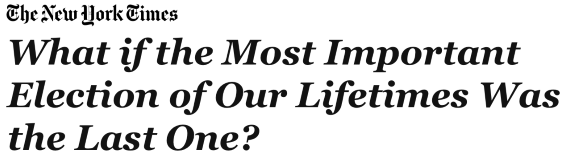 in eine eventuell apokalyptische Zukunft: wenn Trump erneut gewinnt, ist das möglicherweise („what if [...]?“) das Ende der amerikanischen Demokratie und wird es evtl. überhaupt keine weiteren Wahlen (die diesen Namen verdienen) mehr geben.