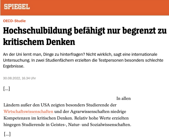 Da bleibt gleich festzuhalten: eine Hochschul"bildung", die nicht zu kritischem Denken befähigt, ist gar keine Bildung, sondern nur eine (allemal auch wichtige) Ausbildung.