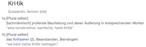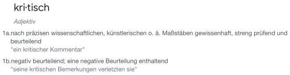 Es ist schade, dass die Wörter "kritisch" und "Kritik" oft nur im Sinne von 1b. verstanden werden: dass also Kritik angeblich immer Negativkritik ist.