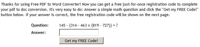 Das Programm "PDF to Word Converter" ist zwar Freeware, aber damit es funktioniert, muss man es trotzdem registrieren lassen, und zwar, indem man Terme vereinfacht. Das sieht dann z.B. so aus: